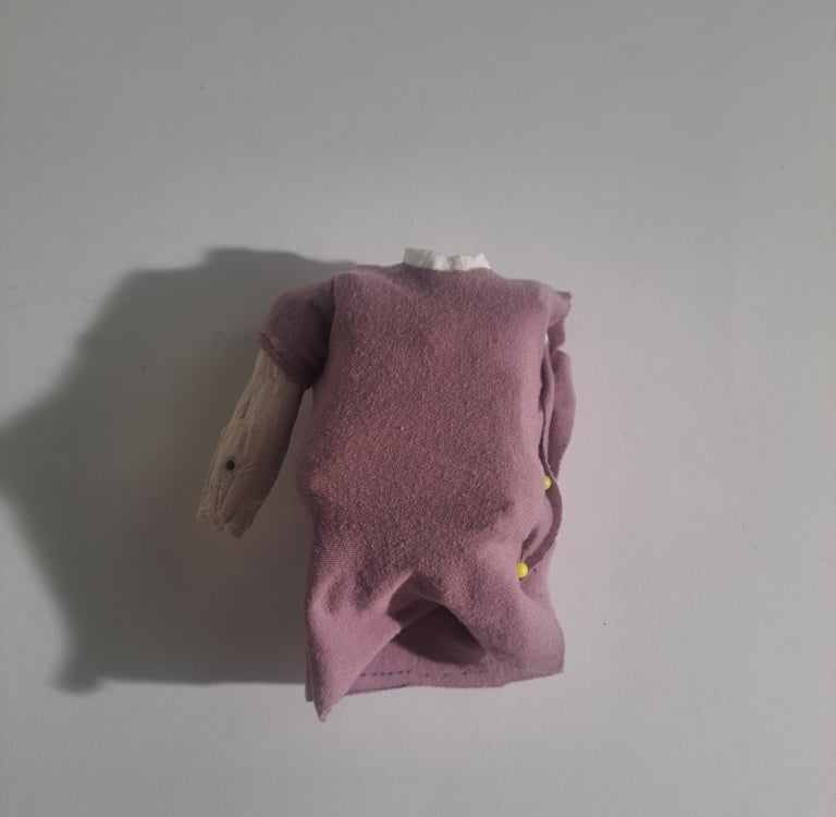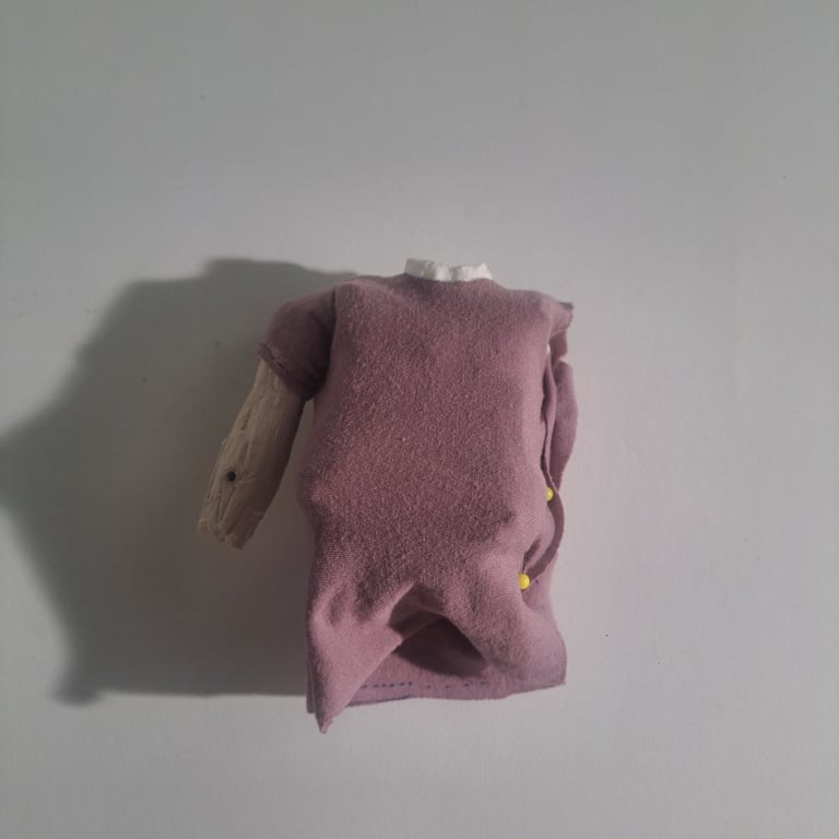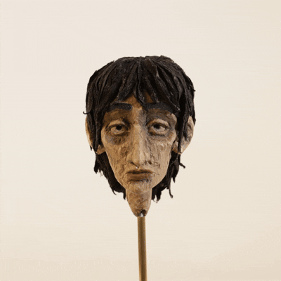 The Main character's wig was first sculpted and cast in plastic. The base was adjusted to accommodate the fabric buildup and allow for the inclusion of basic rigging . Individual layers of fabric where then cut, glued and painted.